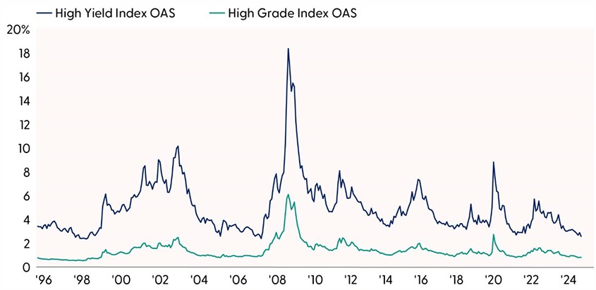 Option-adjusted spreads (OAS) represent the additional compensation for holding risky debt and, generally speaking, corporate credit OAS is a good barometer for the overall health of the economy. So, the fact that both high grade and high yield company credit OAS have remained close to secular tights, unlike during 2022 when spreads widened on the back of higher inflationary pressures, suggests the corporate sector is in good shape and credit markets aren’t overly concerned about inflation reaccelerating. Additionally, despite volatility in the Treasury markets, we haven’t seen the same volatility in corporate credit spreads, which is a good sign that the economy broadly is still in pretty good shape.