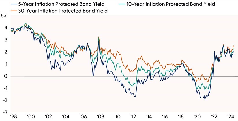 The recent move higher in Treasury yields has been unusual but not unprecedented. In fact, the rise in longer-term interest rates can really be thought of as a normalization of the Treasury yield curve. The U.S. Treasury yield curve had been inverted (meaning shorter-maturity securities had a higher yield than longer-maturity yields, which is historically infrequent) for years, so the move higher in yields represents an economic environment that has outperformed expectations and is no longer pricing in the prospects of recession. That is, the Treasury yield curve is moving back to its normal upward-sloping shape. While inflation expectations have increased recently, the bond market isn’t convinced that a second wave of inflation pressures is imminent. Better growth and the potential for elevated levels of Treasury supply coming to market have been the primary reasons yields have moved higher. But if the bond market is wrong, investors could look to TIPS to provide an inflation hedge for portfolios.