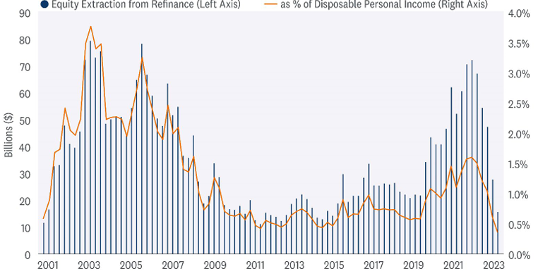 Recent data on refinancing activity provides a clue on why the economy has experienced a delayed landing. The housing market often explains a lot of what is happening in other sectors of the economy, and this time is no different. Roughly one-third of mortgages were refinanced in the quarters following the pandemic recession of 2020.1 And because of 2020’s extremely low mortgage rates, these homeowners lowered their monthly payments, thereby increasing their disposable income. Other homeowners took advantage of healthy home equity and took cash out to support more spending.