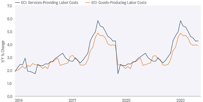 Leading indicators for services inflation suggest the deceleration should continue. The Employment Cost Index (ECI), a comprehensive measure for labor costs, indicates further deceleration in inflation.