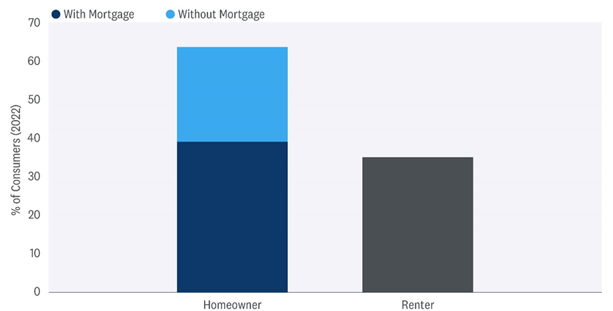 One of the Fed’s monetary tools involves setting the federal funds rate, an interest rate that influences other market rates such as bank loans, CD rates, and mortgage rates. Typically, higher rates will slow the economy and release some of the pressure on consumer prices. But that hasn’t happened, at least not uniformly across the economy, nor at the same magnitude as previous years. One reason some parts of the economy appear immune to high rates is the growing percentage of homeowners who either don’t have a mortgage at all or have a mortgage they refinanced in 2020 or 2021.